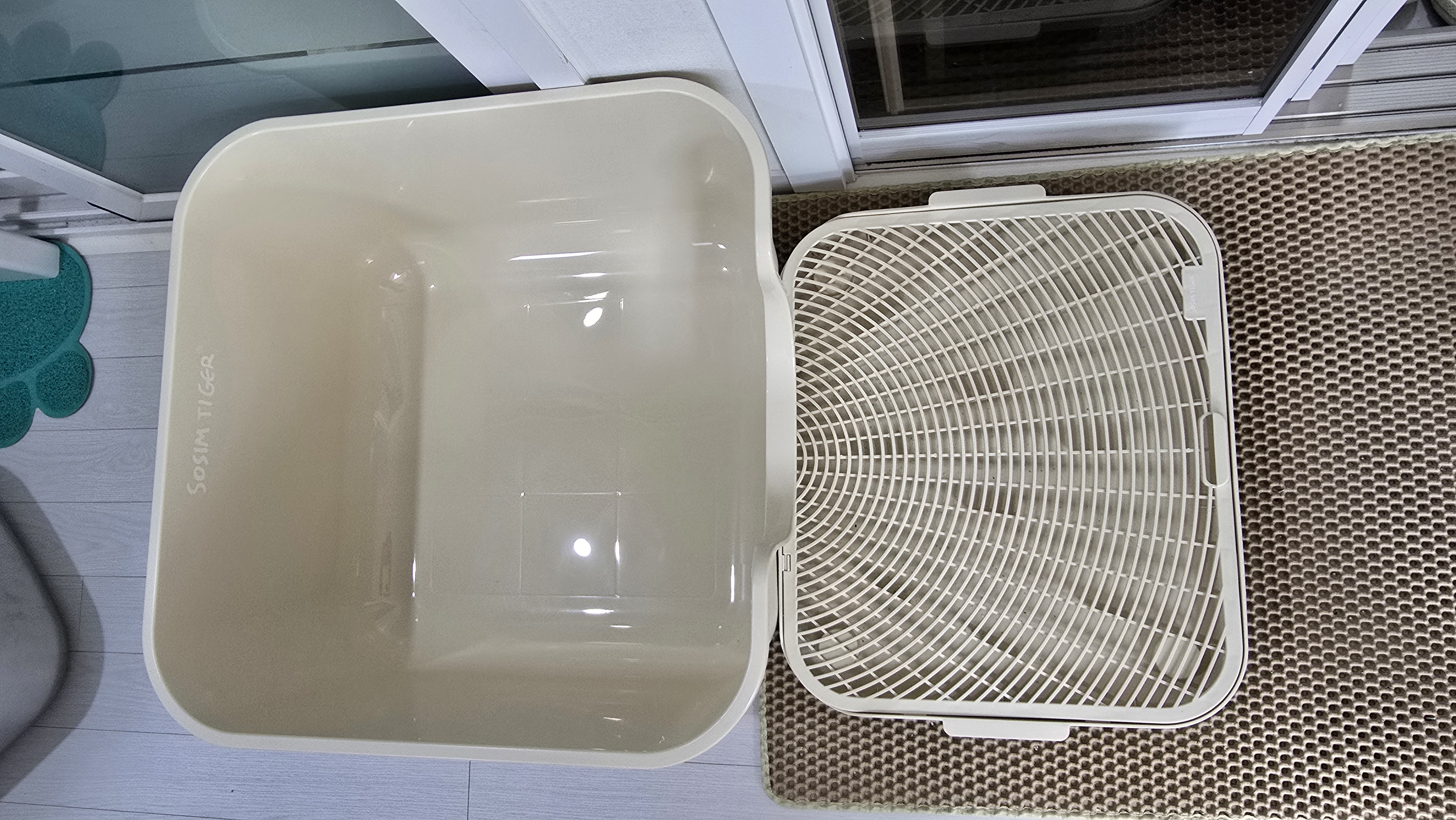 가로세로 61cm의 대형 사이즈라 오픈형임에도 여유로운 구조입니다. 입구 높이가 적당해서 모래가 밖으로 튀는 일도 거의 없을 듯합니다. 패드, 심쿵발판, 진심박스를 함께 쓰니 모래 사막화가 현저히 줄었고 청소도 훨씬 편해졌습니다.