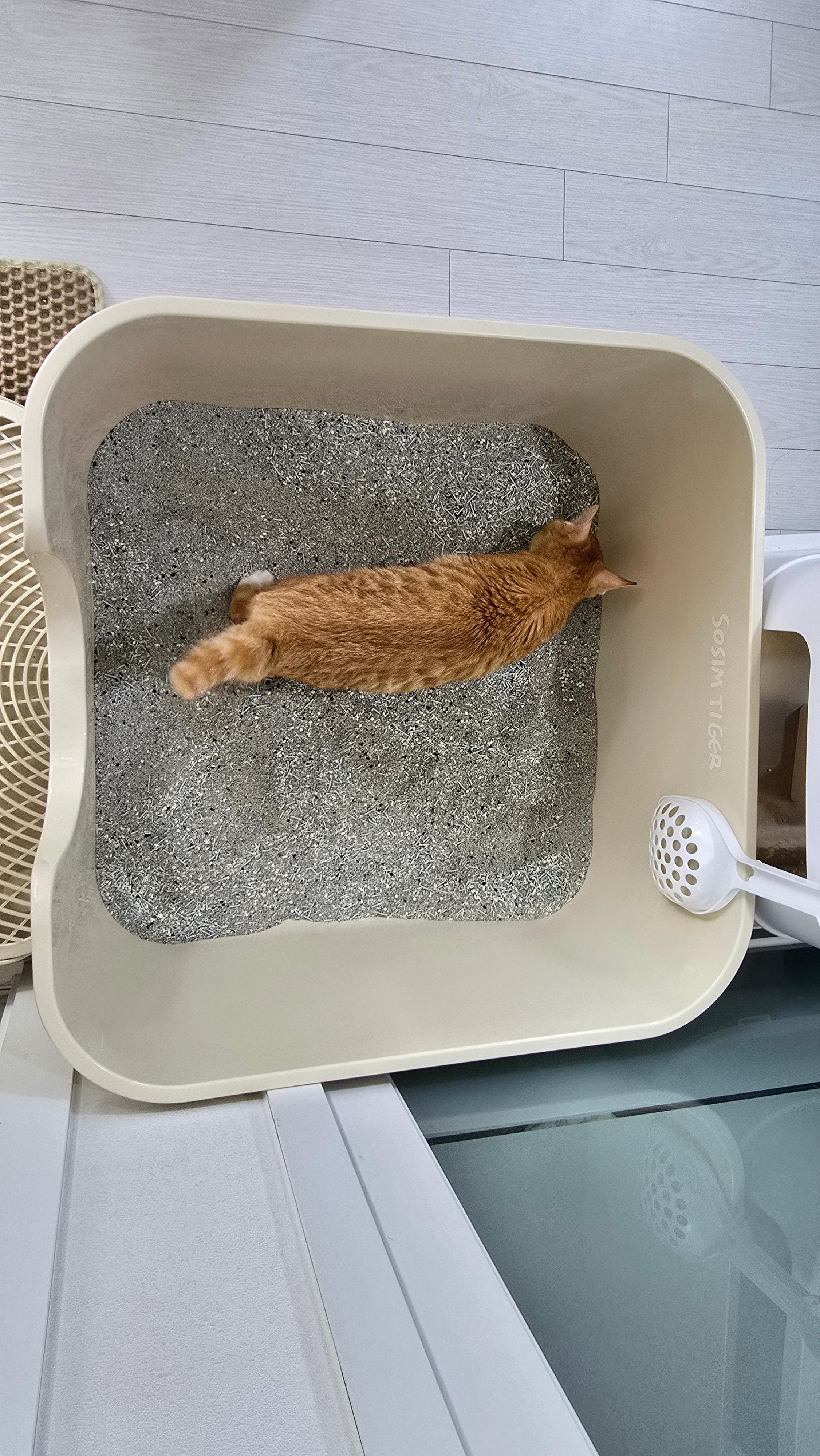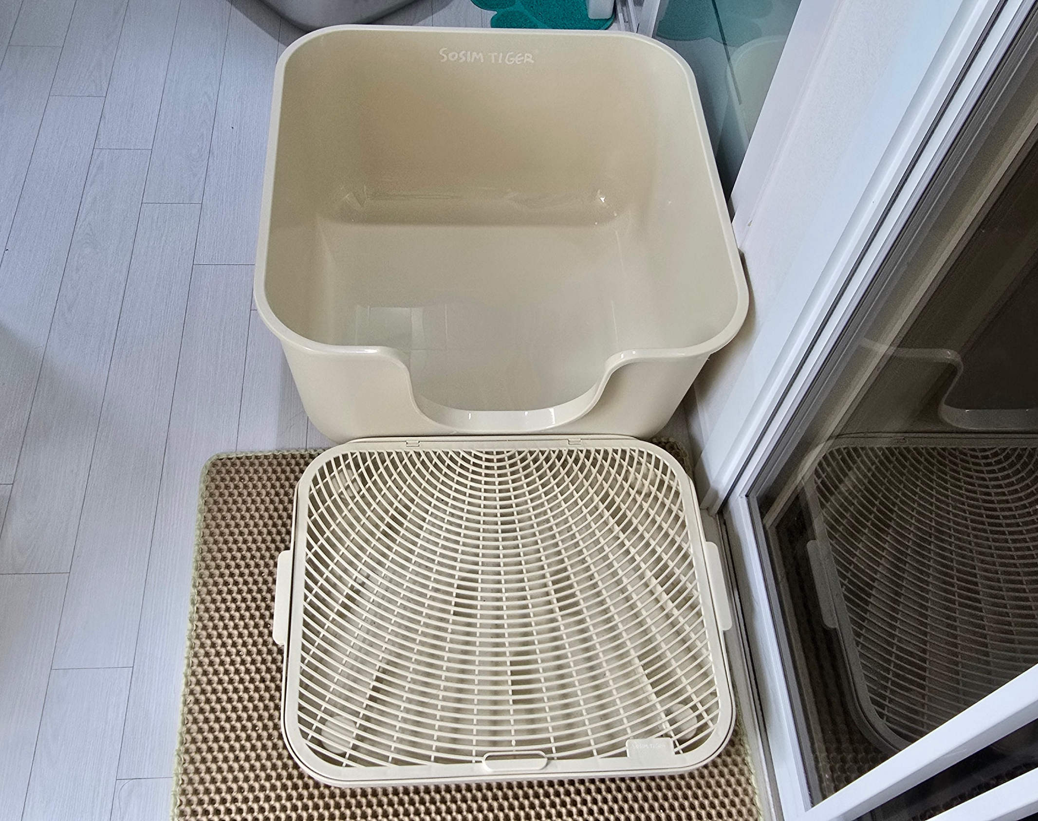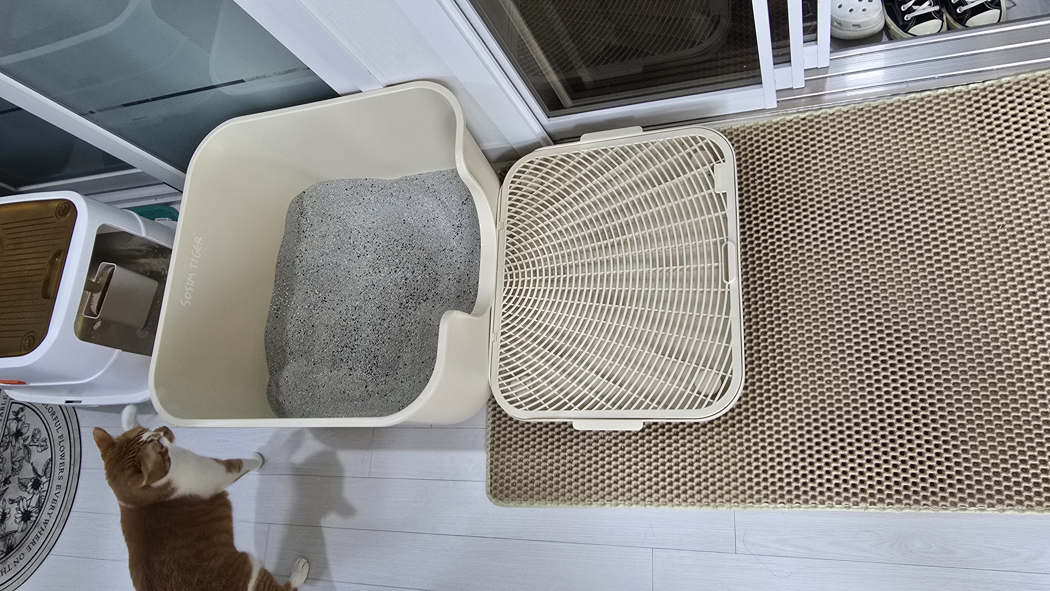 색상은 아이보리로 선택했습니다. 새로 들인 제품은 ‘소심한 호랑이 고양이화장실 대형 스퀘어 진심박스’. 대형 화장실답게 설치하자마자 화장실이 반으로 줄어든 느낌이 들 정도였습니다. 기존 제품보다 폭이 확실히 넓고, 통로는 좁아졌지만 안정감이 뛰어납니다.