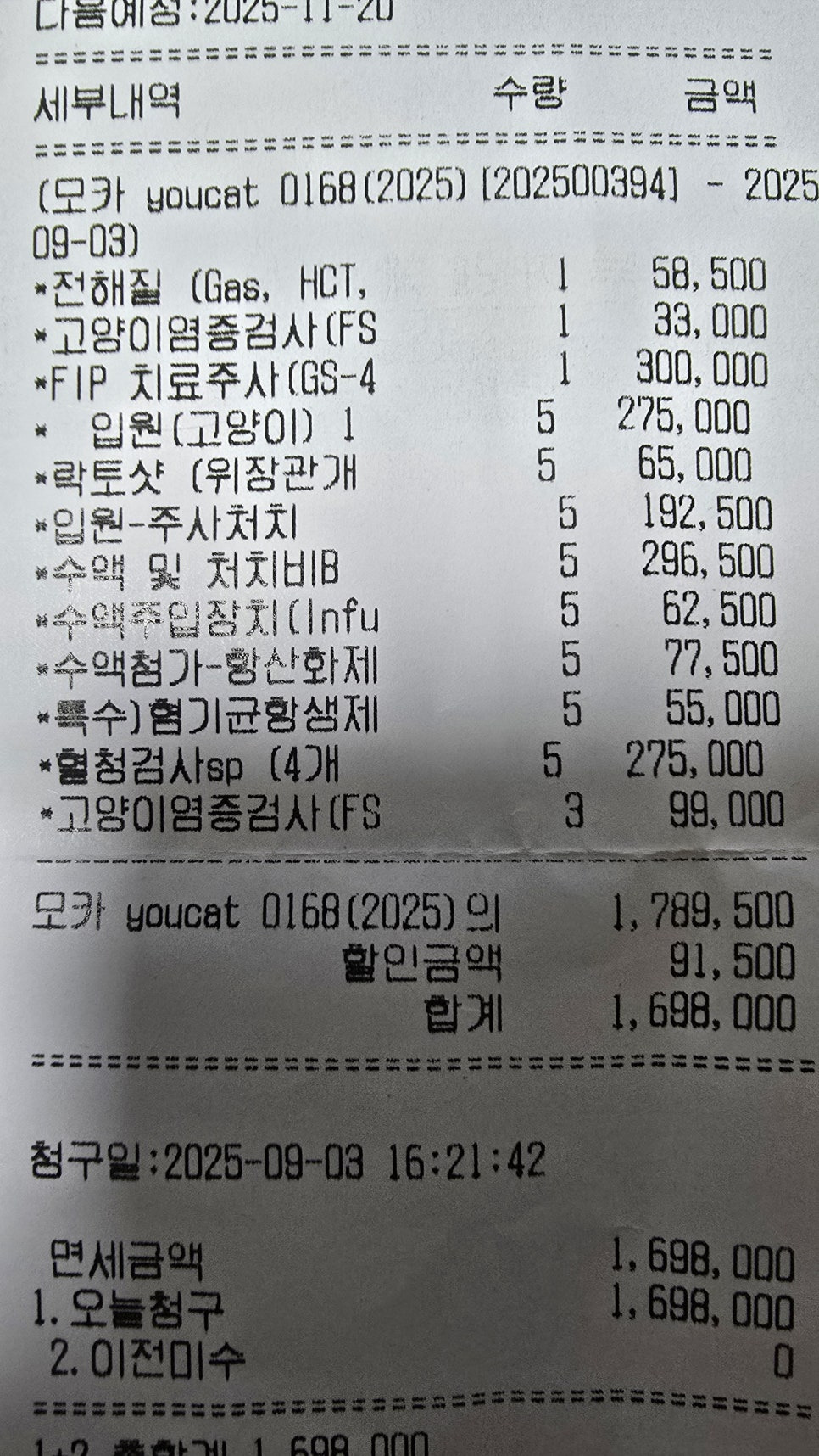 병원에서 안내 받은 금액중 가장 큰 금액은 주사제 비용이었습니다.