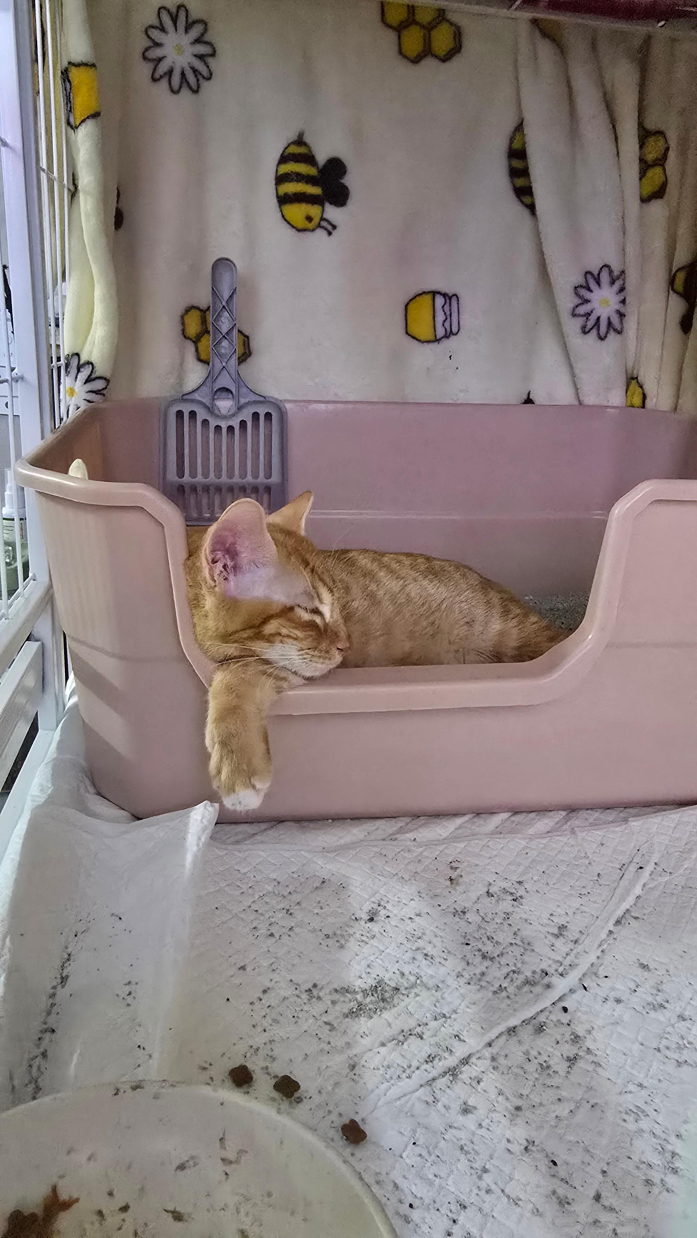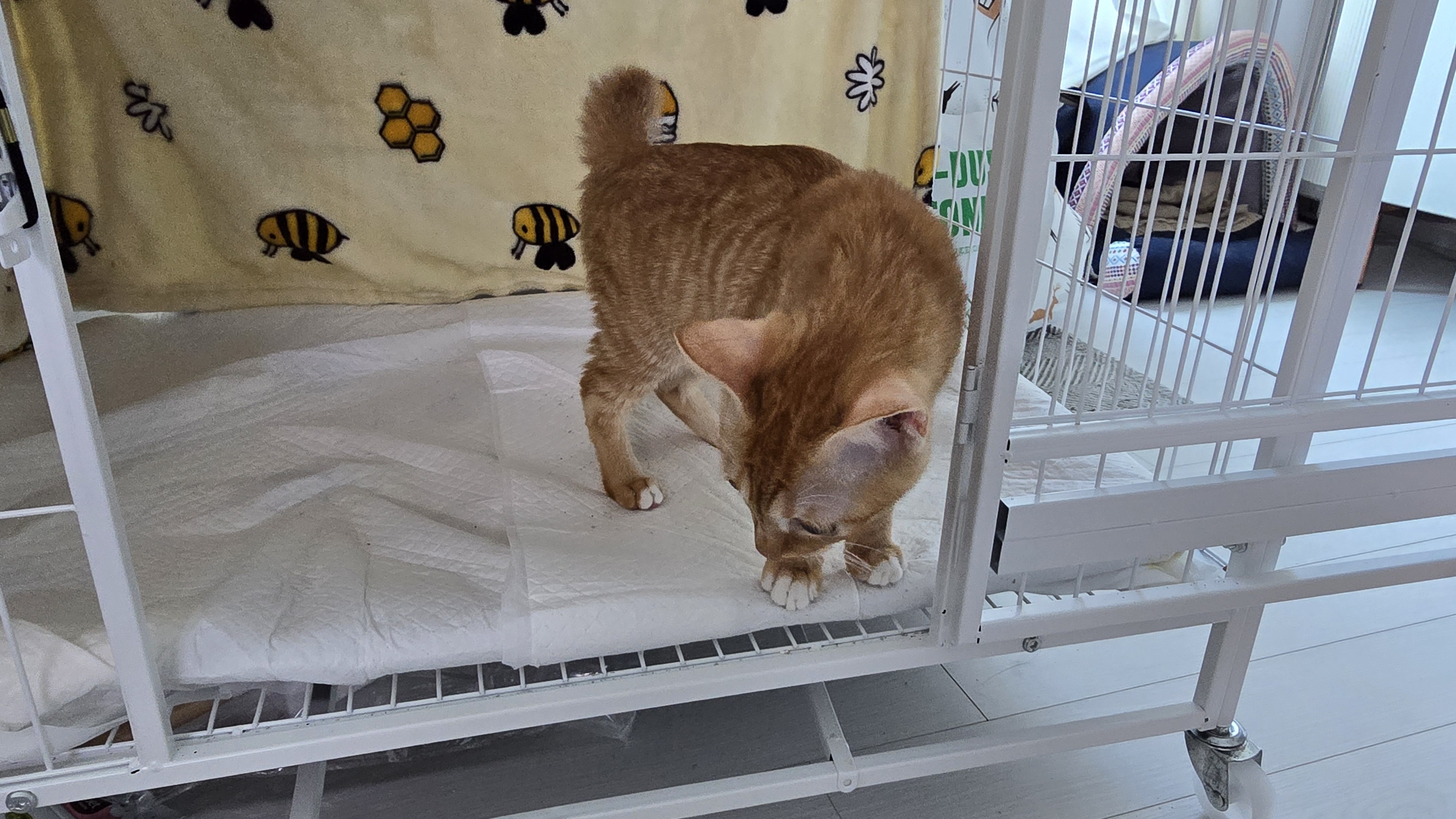 밤이 되자 케이지 안 화장실 구석에 자리 잡고는 정말 오랜만에 깊은 잠에 빠졌습니다. 몸을 만져도 반응이 없을 정도로 숙면 중이더군요. 이런 모습을 본 게 얼마나 오랜만인지 모르겠습니다. 그동안은 늘 주변 소리에 예민하게 반응하며 얕은 잠만 자던 모카였는데, 오늘은 마치 모든 경계심을 내려놓은 듯 평온해 보였습니다.
