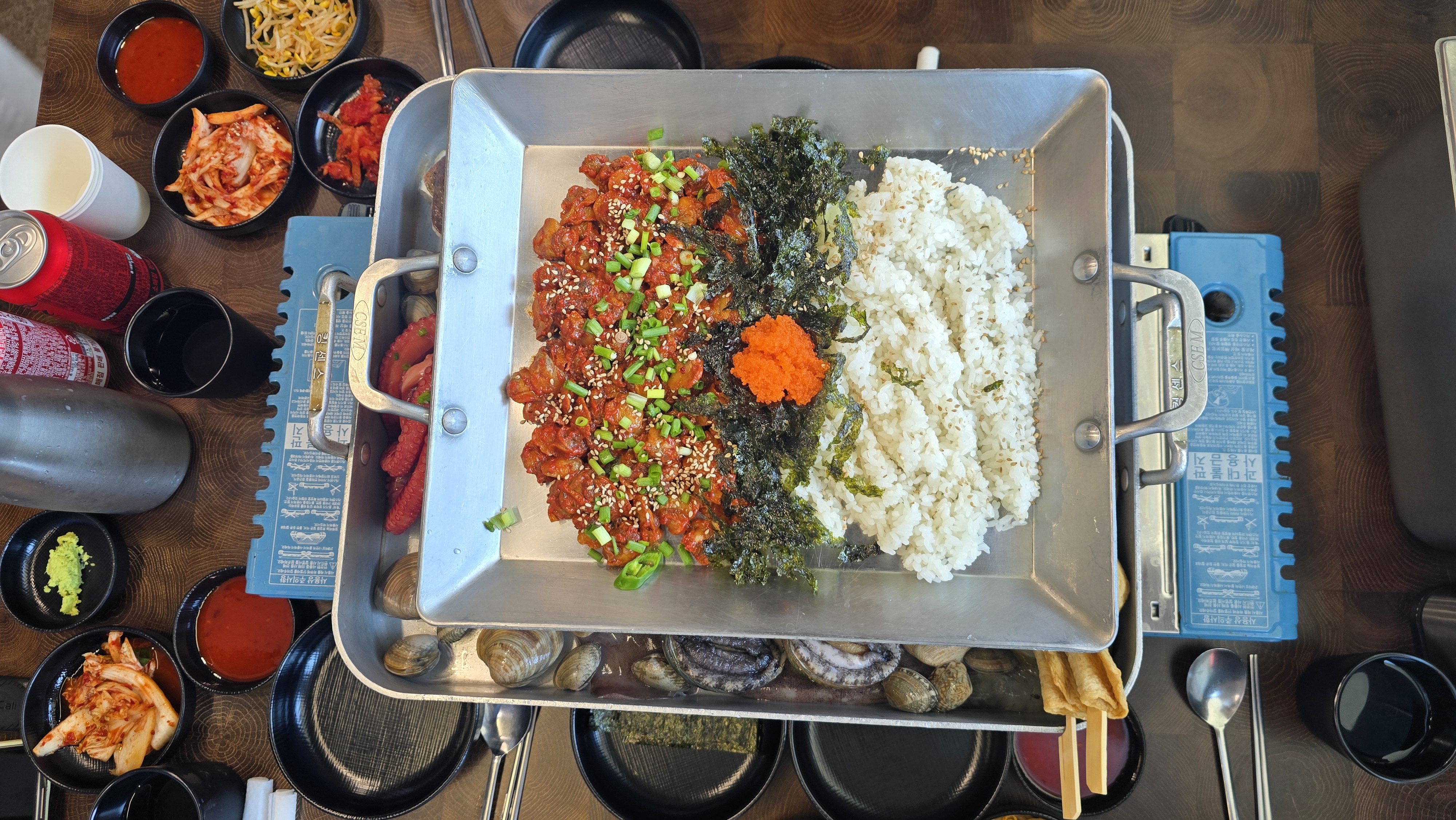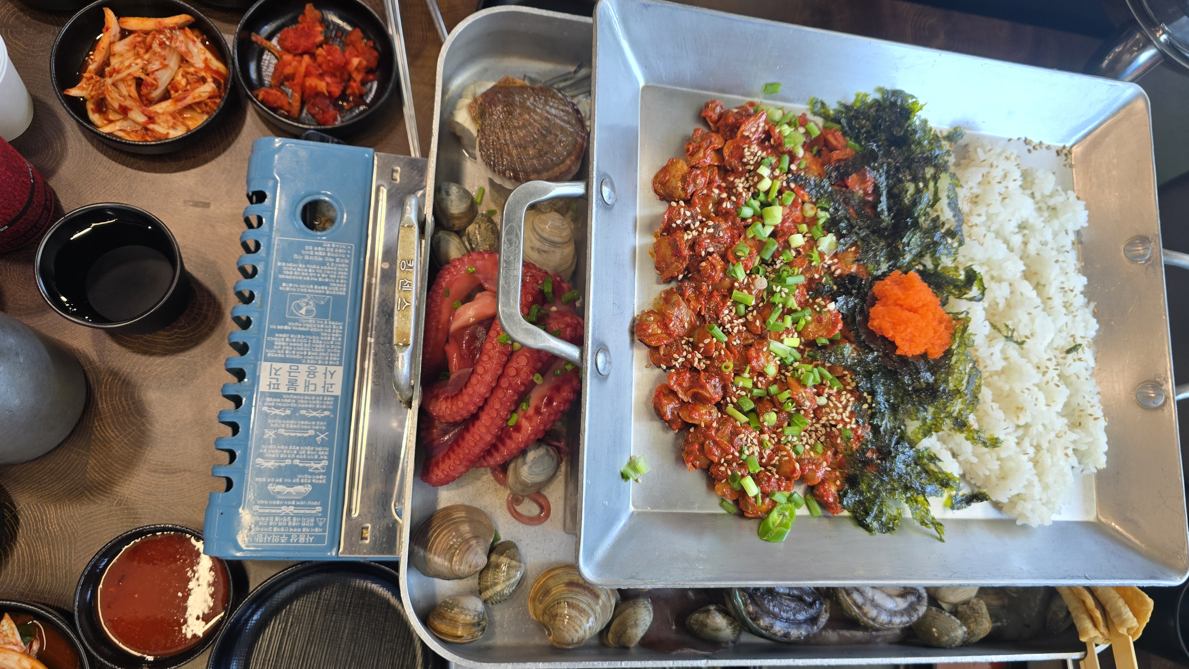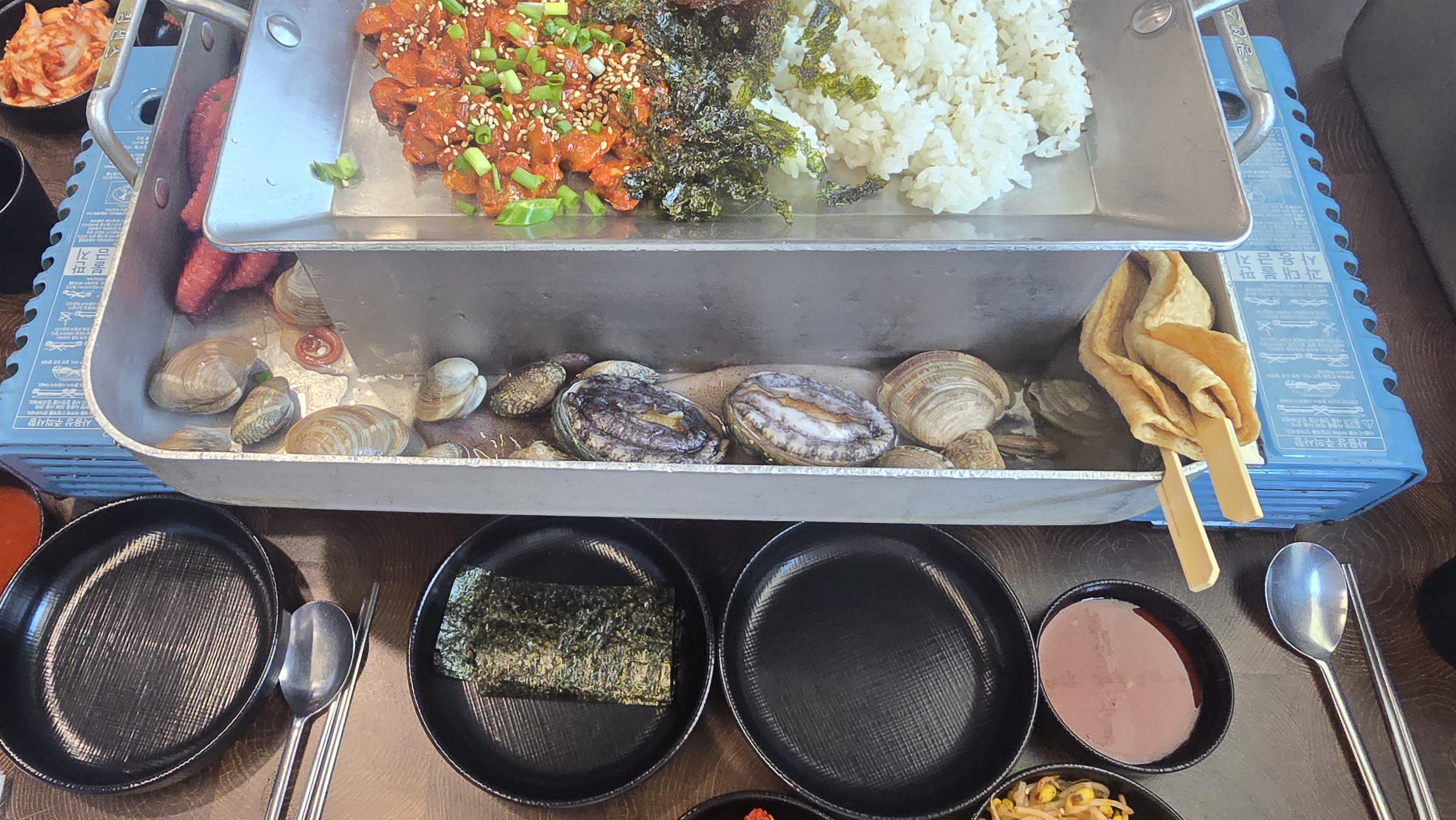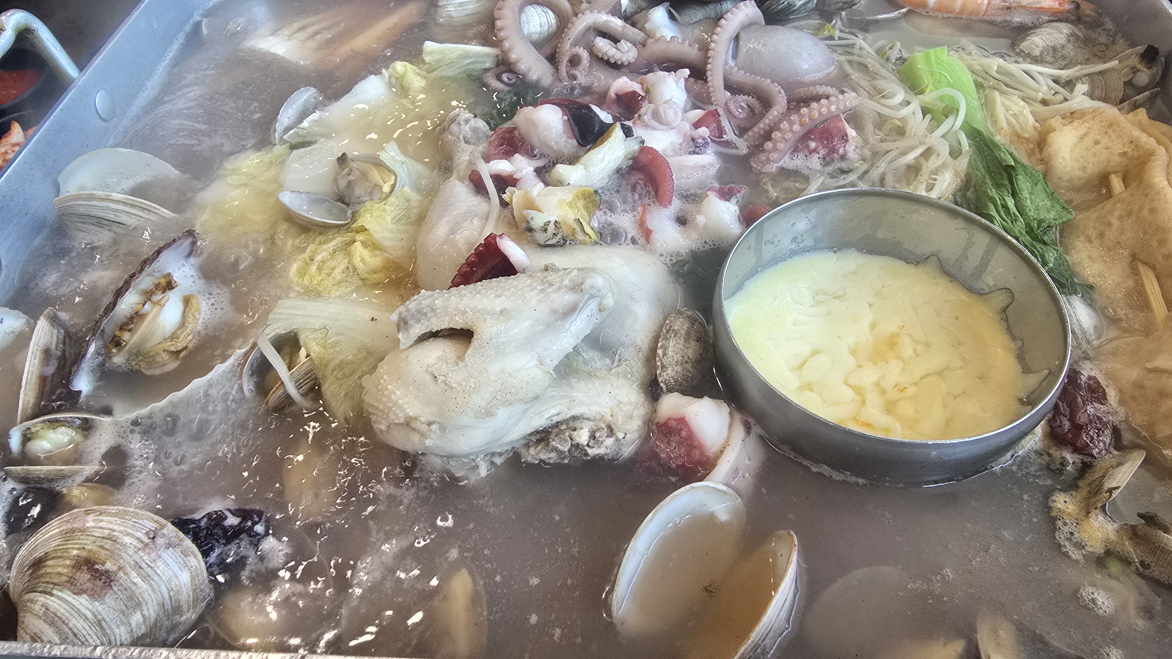커다란 쟁반 위에 육수를 부어 끓여 먹는 스타일로, 맨 위에는 신선한 꼬막무침이 듬뿍 올려져 나왔습니다. 덕분에 식사 시작 전에 맛있는 꼬막비빔밥부터 즐길 수 있었죠. 매콤달콤한 양념에 꼬막과 채소를 쓱쓱 비벼 먹으니 입맛이 확 살아나는 기분이었습니다.