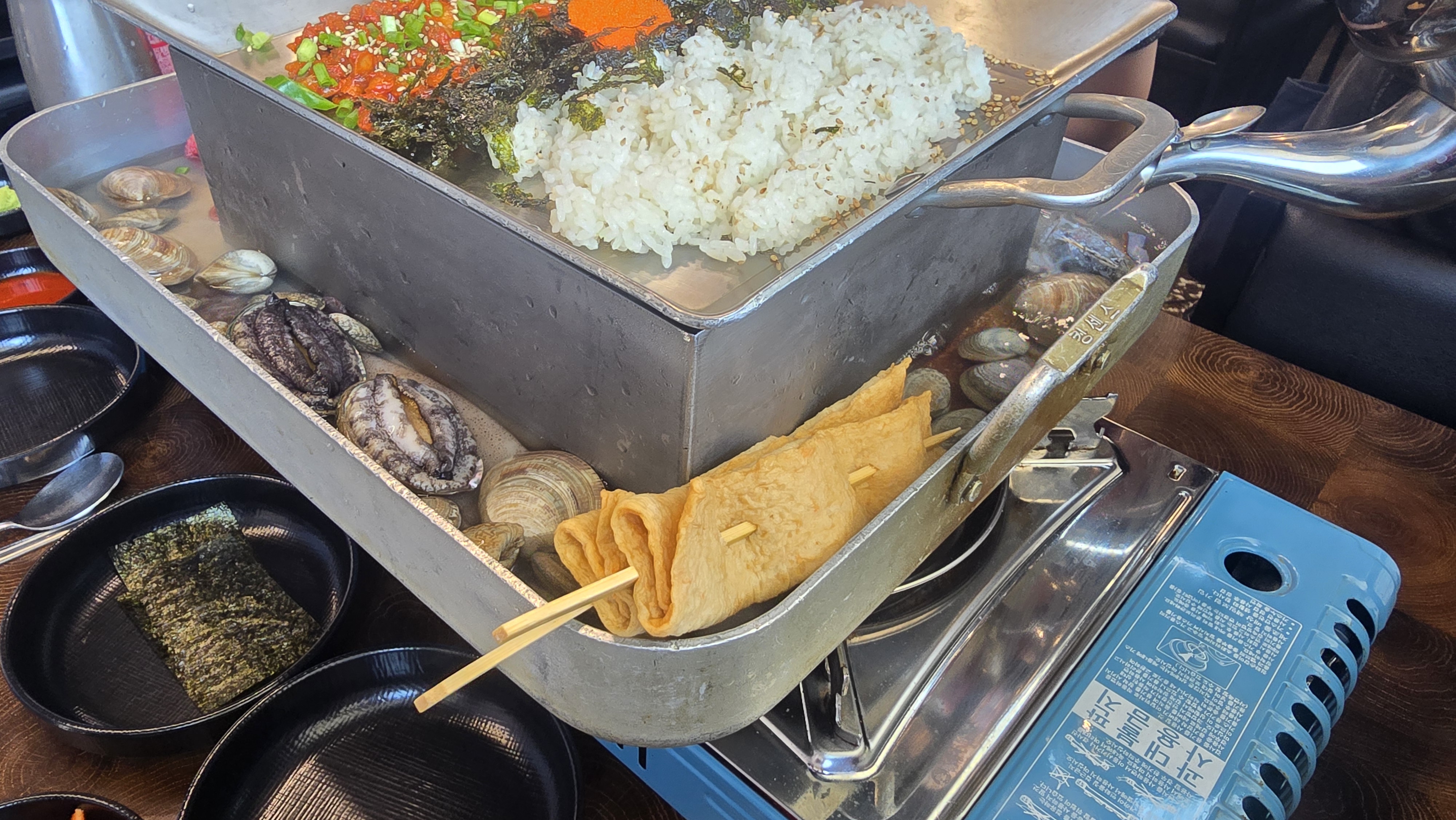 전복, 쫄깃한 문어, 야들야들한 낙지, 꼬들꼬들한 어묵, 그리고 시원한 국물 맛을 더해주는 다양한 조개들이 빈틈없이 자리 잡고 있었습니다.