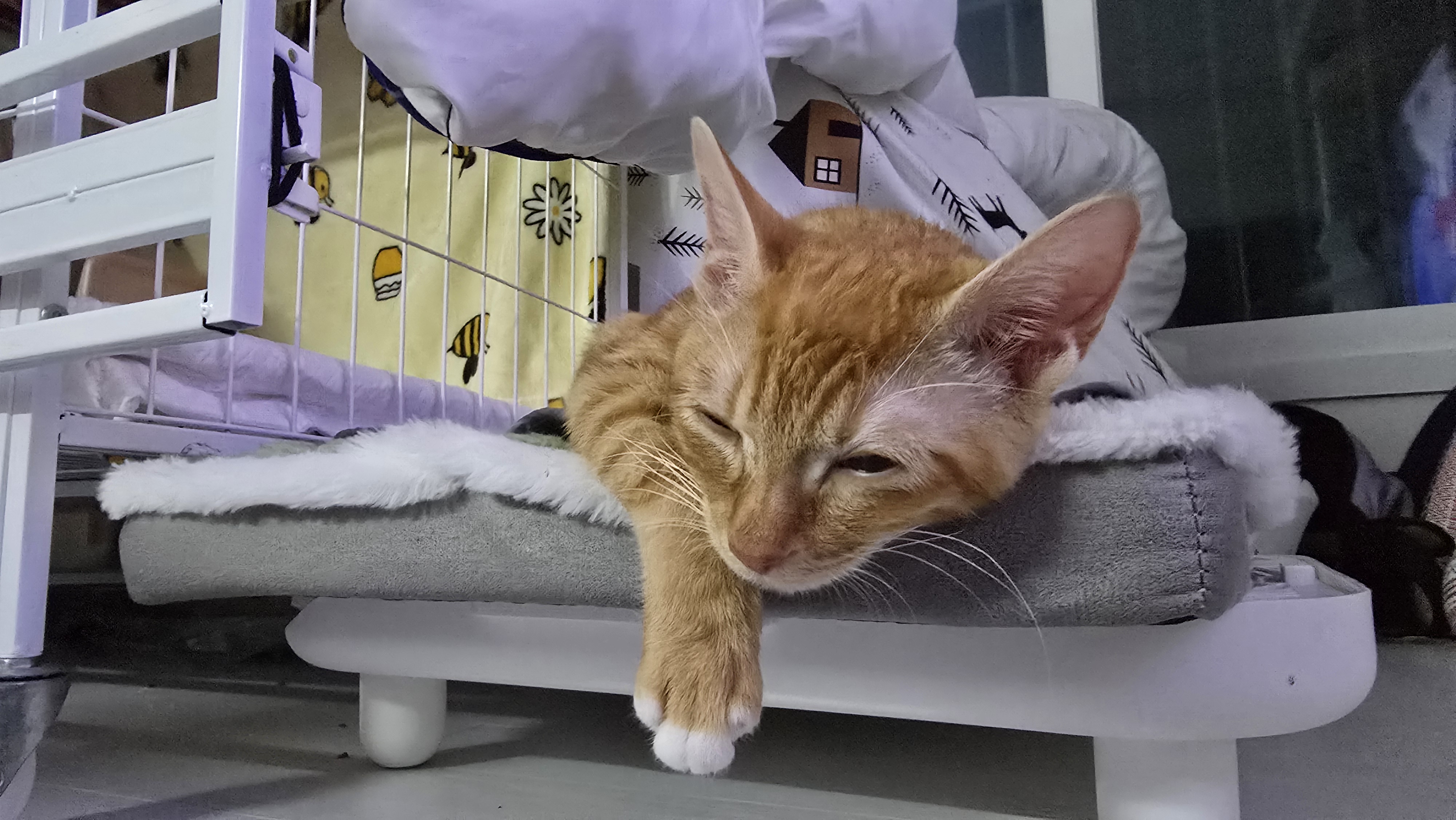 모카는 고양이 복막염으로 인한 건식 신경증상을 겪고 있으며, 초기 증상이 강하게 나타나 뇌 손상 가능성도 일부 고려된 상황입니다. 유사 사례들을 살펴봐도 예후가 일정하지 않고, 개별적인 치료 과정 차이로 인해 일반적인 기준으로 예측하기 어려운 상황입니다. 낮 동안 모카는 안정적인 컨디션을 유지하며 행동과 동공 반응에서도 심리적 안정이 확인됩니다.