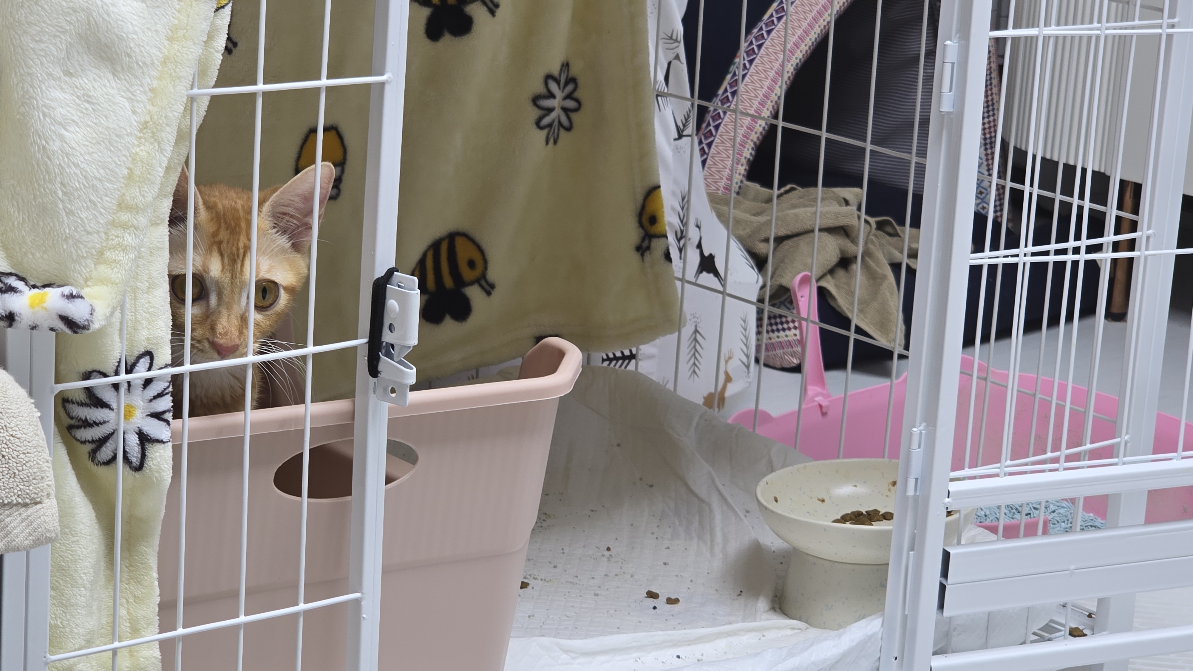 최근에는 혼자 케이지 안으로 들어가 화장실에 머물거나 잠드는 모습이 자주 보입니다. 불안감이 줄어든 듯 차분한 행동을 보이는 점이 이전과 달라졌습니다.