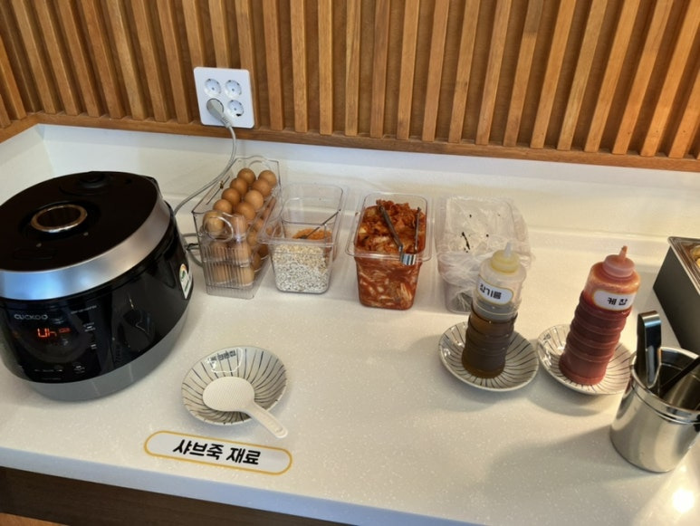 셀러드바에 있는 재료를 이용해 죽을 만들어 드셔도 되는데 이미 포화 상태라 저흰 포기했네요.