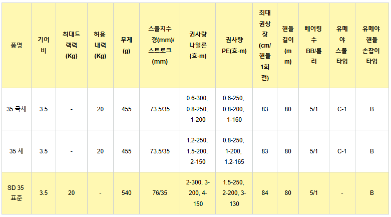 기어비(3.5), 최대 드랙력(SD 35 표준 모델 20kg), 무게(35 극세/세 455g, SD 35 표준 540g), 스풀 치수(73.5/35mm 또는 76/35mm), 권사량 등 핵심 성능 지표에는 변화가 없습니다. 이는 서프리더가 이미 확고한 기본 성능과 내구성을 갖추고 있었음을 방증하는 부분입니다.