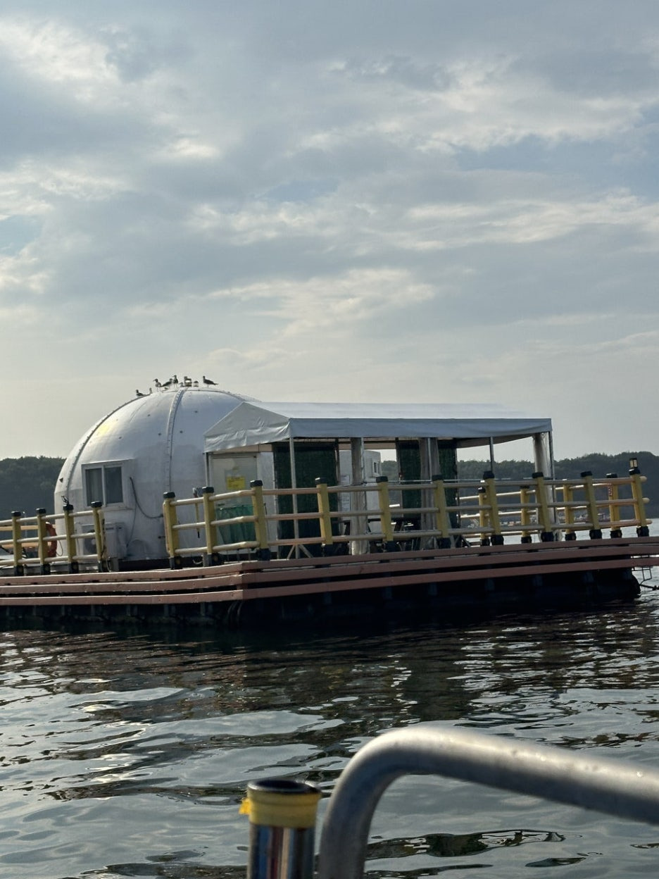 짐과 함께 배를 타고 이동 하시면 동그란 돔으로 된 해상 펜션이 기다립니다.