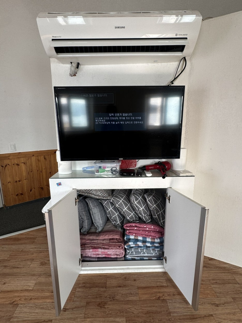 에어컨 션하고 ~~ 티비는 잘 안나오지만.. 침구류도 깔끔한 편이고.. 좋았습니다.