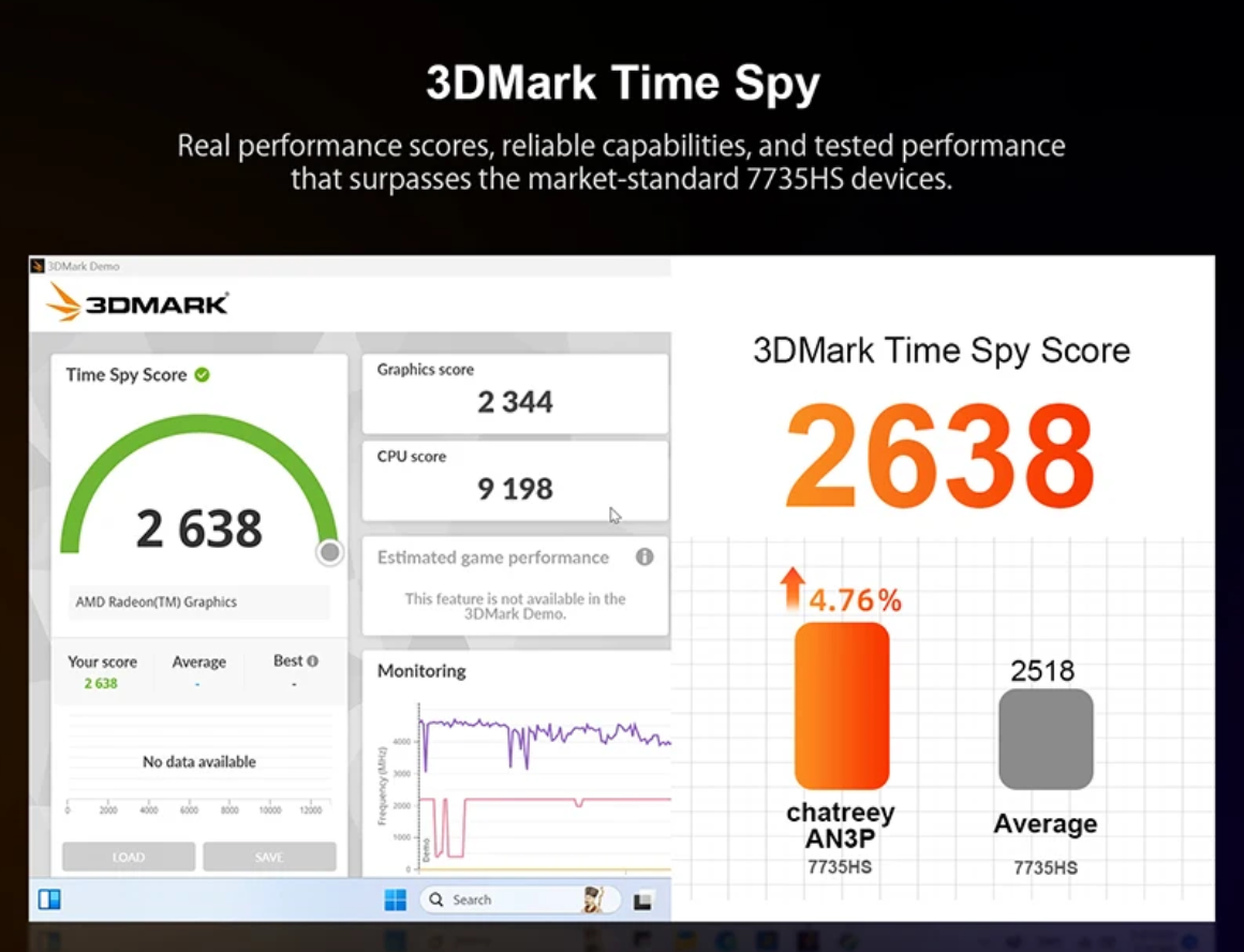 차트리 AN3P의 가장 큰 매력은 손바닥만한 크기에 고성능 노트북급 사양을 꽉 채워 넣었다는 점입니다. 심장부에는 AMD Ryzen 7 7735HS 프로세서가 탑재되어 있습니다. 8코어 16스레드 구성에 최대 4.75GHz까지 작동하는 이 CPU는 사실상 웬만한 데스크탑 프로세서와 견주어도 손색이 없는 멀티태스킹 능력을 자랑합니다.
