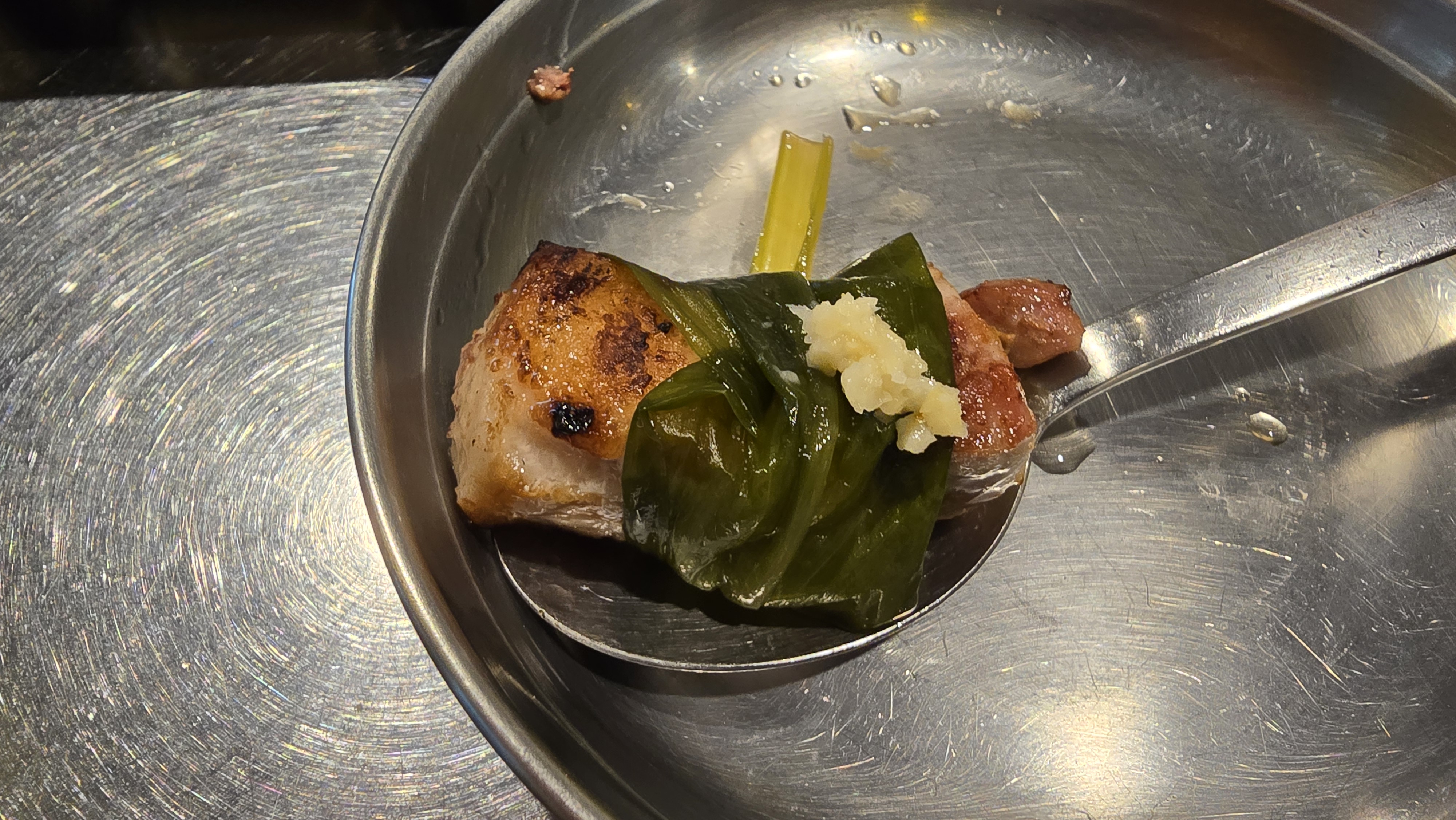 명이나물에 고기 한 점, 와사비 올려서 한입에 넣는 순간 숙성 고기의 깊은 풍미가 입안을 가득 채운다.