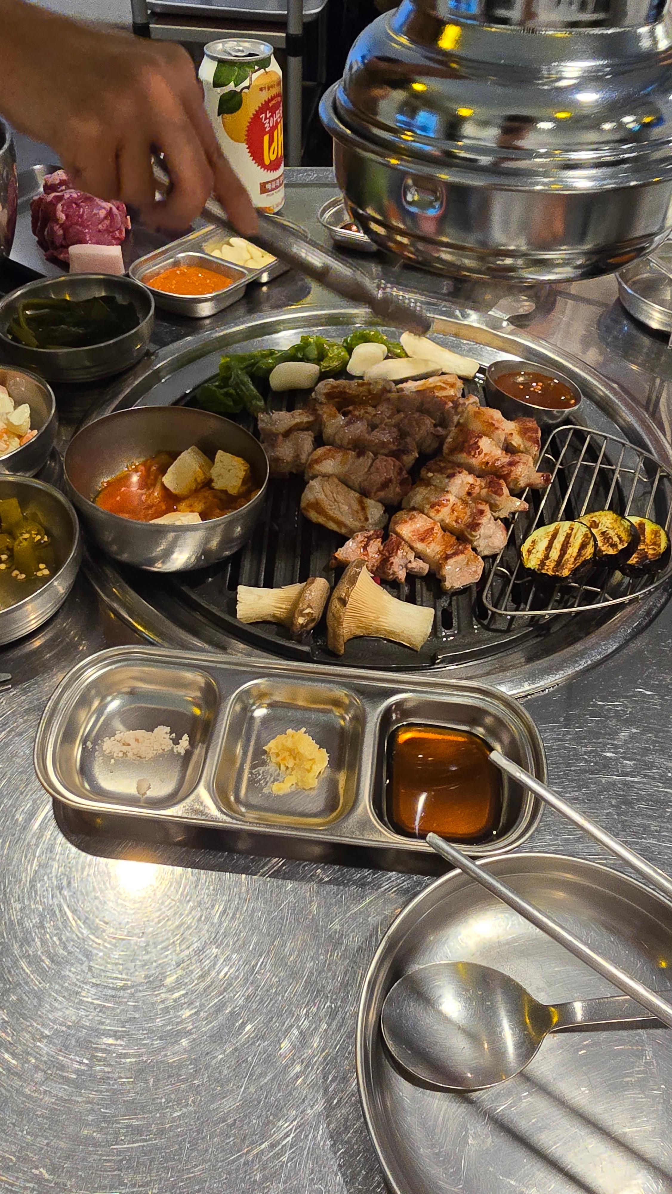 두툼한 숙성 삼겹살은 칼집이 곱게 들어가 있었다. 불판엔 꽈리고추, 버섯, 가지, 가래떡까지 올라가서 보는 재미도 있다.
