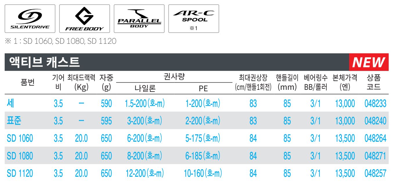 이번 액티브 캐스트는 기존 액티브 서프 모델을 흡수하여 '액티브 캐스트' 단일 브랜드로 통합된 점이 눈에 띕니다. 가장 큰 변화는 드랙릴과 논드랙릴로 완전히 분리된 라인업입니다.